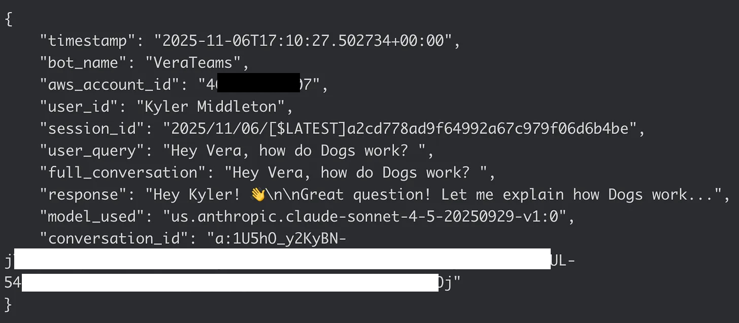 When we first deployed these bots, we relied on AWS Bedrockâs built-in logging. Every API call generates a log entry with timestamps and request IDs. Our Lambda functions logged to CloudWatch. We figured we had full visibility. If security needed to audit a conversation, theyâd just look at the logs.