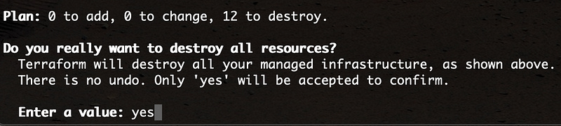 So my recommendation in case you want to step away for a while is to destroy everything. Terraform has a handy command that helps us do this: terraform destroy