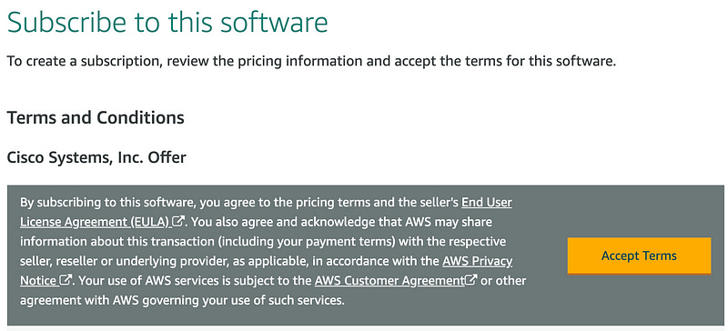 Hit “Accept Terms” to agree to all the T&C’s for Cisco ASAv in AWS.