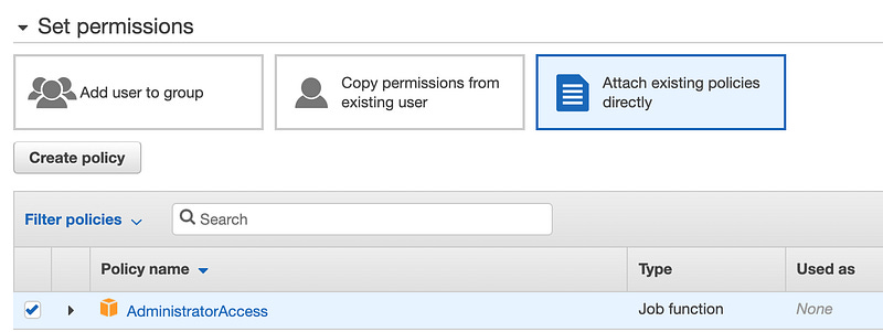 This user now exists, but can’t do anything. For a more in-depth look at IAM (and it does go deep), refer to the same earlier blog about assuming an IAM role. To grant it permissions, we can either create a custom policy with specific and limited permissions, or we can link to existing policies. For the sake of this demo, we’ll use “AdministratorAccess”, but remember this step as another opportunity for extra security in a real enterprise environment.