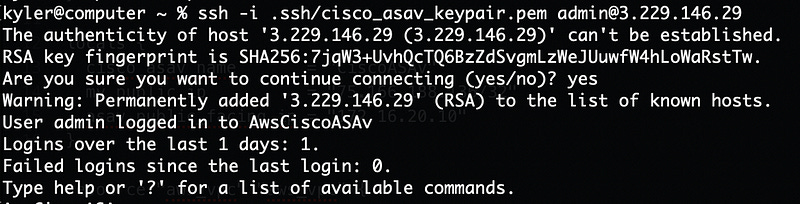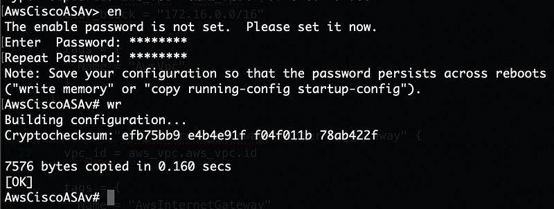 The config above requires connecting to the device with username admin and no password. We entrust the ec2 SSH key requirement to protect us. If you want to further secure your device you can either modify this file (which will rebuild the ASA once you run terraform apply