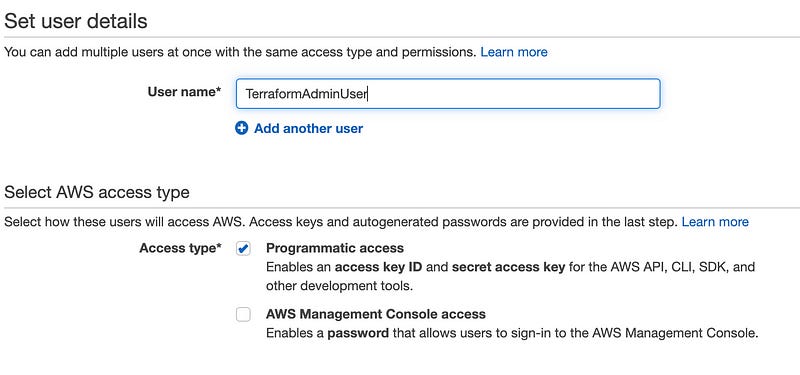 Name your user. It can be anything, but it’s helpful to have it named something you recognize later. Terraform can only do what the IAM user can do, and we’re going to make it a global administrator within this account, so I like to include “Admin” in the same so I remember not to share the access creds.