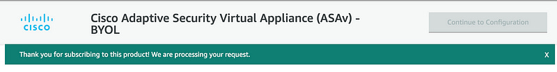 Subscribe to Cisco ASAv on AWS Marketplace — Resources from the AWS Marketplace can’t be deployed without first subscribing to the resource, which really just means clicking the “subscribe” button (at no cost), so we’ll click that button.