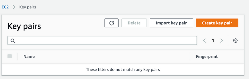 As you can see, in a new AWS account there aren’t any key-pairs yet. In the top right, click on “Create key pair”.