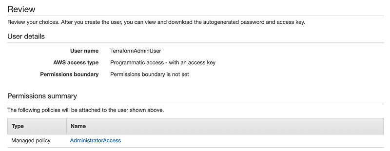 Create an IAM user with admin rights — We’ll need to run terraform from our local machine, which means our local CLI has to authenticate to AWS somehow. The way AWS manages this is via a hard-coded username and password tied to an Identity and Access Management (IAM) user.