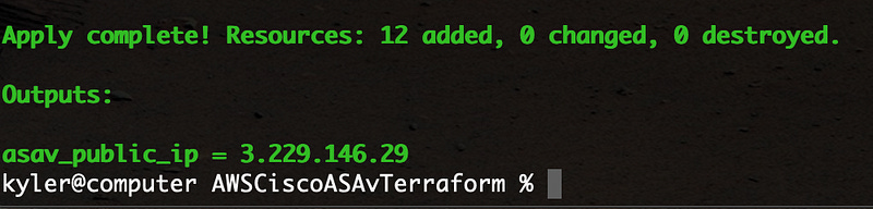 After a few minutes, you’ll hopefully see that Terraform has completed successfully, and will respond with the public IP of your shiny new ASAv device.