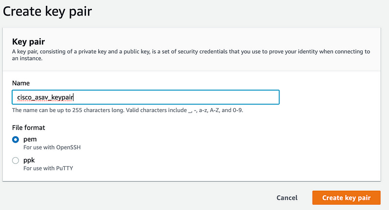 Name the key exactly cisco_asav_keypair for the easiest path forward (that’s what the terraform code we’ll use later will look for). If you’re feeling good about modifying some of the Terraform (heck yeah!) then name the SSH key whatever you’d like. Do leave the key on PEM type if you’re using OpenSSH clients, like the native mac and linux client, or use PPK if you’re using PuTTY on windows.