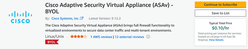 Note that the ASAv10 device doesn’t qualify for free tier status with AWS. The machine we’ll deploy costs $72/month, but it’s billed per minute. So if you keep the thing up for an hour, AWS will charge you $0.10 cents. However, Terraform can build and deploy the device entirely via automation, so once you’re done playing you can just destroy everything and stop the charges — we’ll cover that at the end of this post.