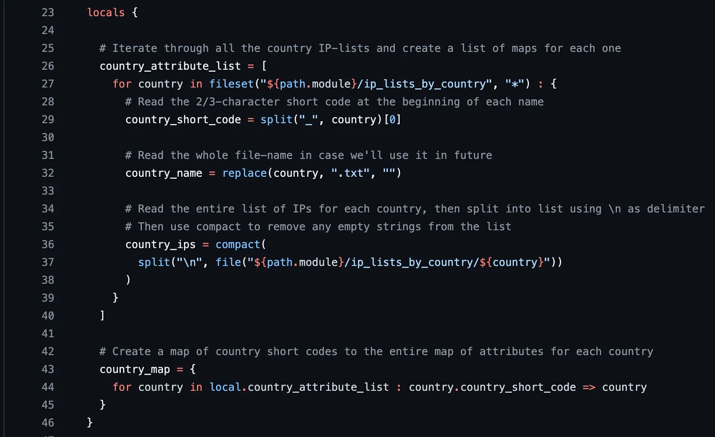 253Oh. I donāt really wanna spend an hour creating static local blocks for every single country. Is there a way to do this dynamically with terraform? Letās find out.