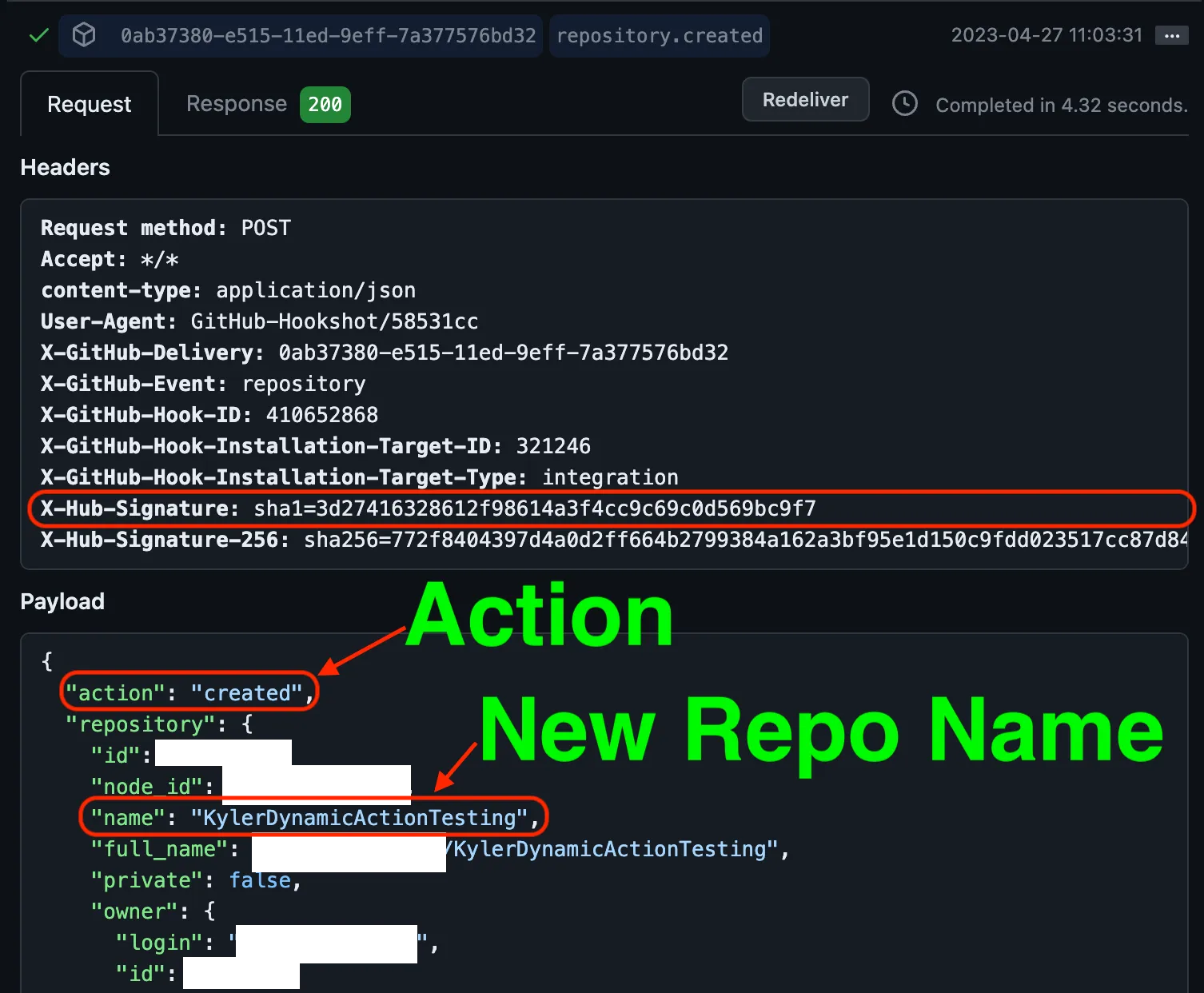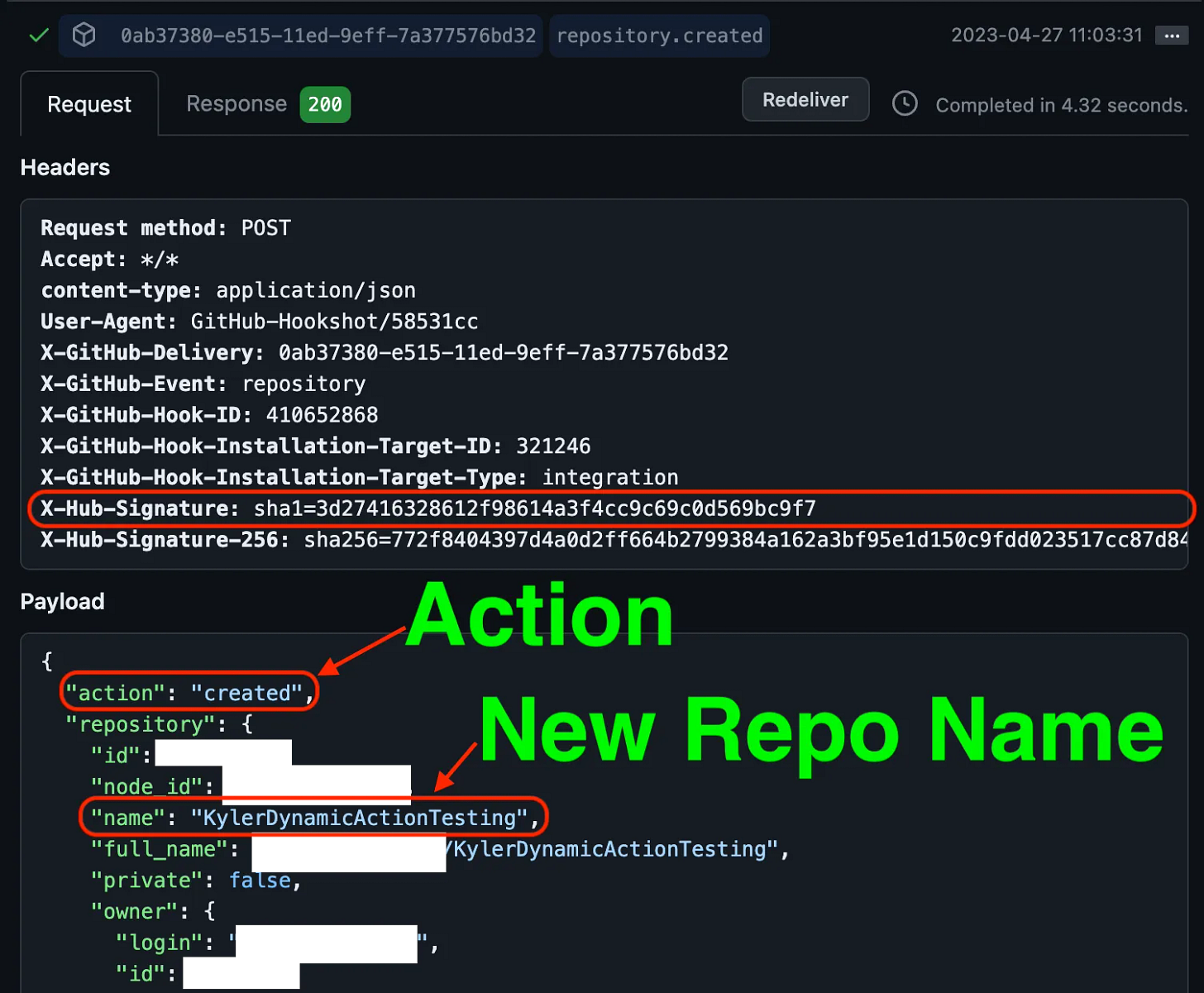 And lastly, the webhook has the name of the new repo, which is apparently KylerDynamicActionsTesting. We need to pass this repo name to our GitHub Action if we want it to configure that one repo.