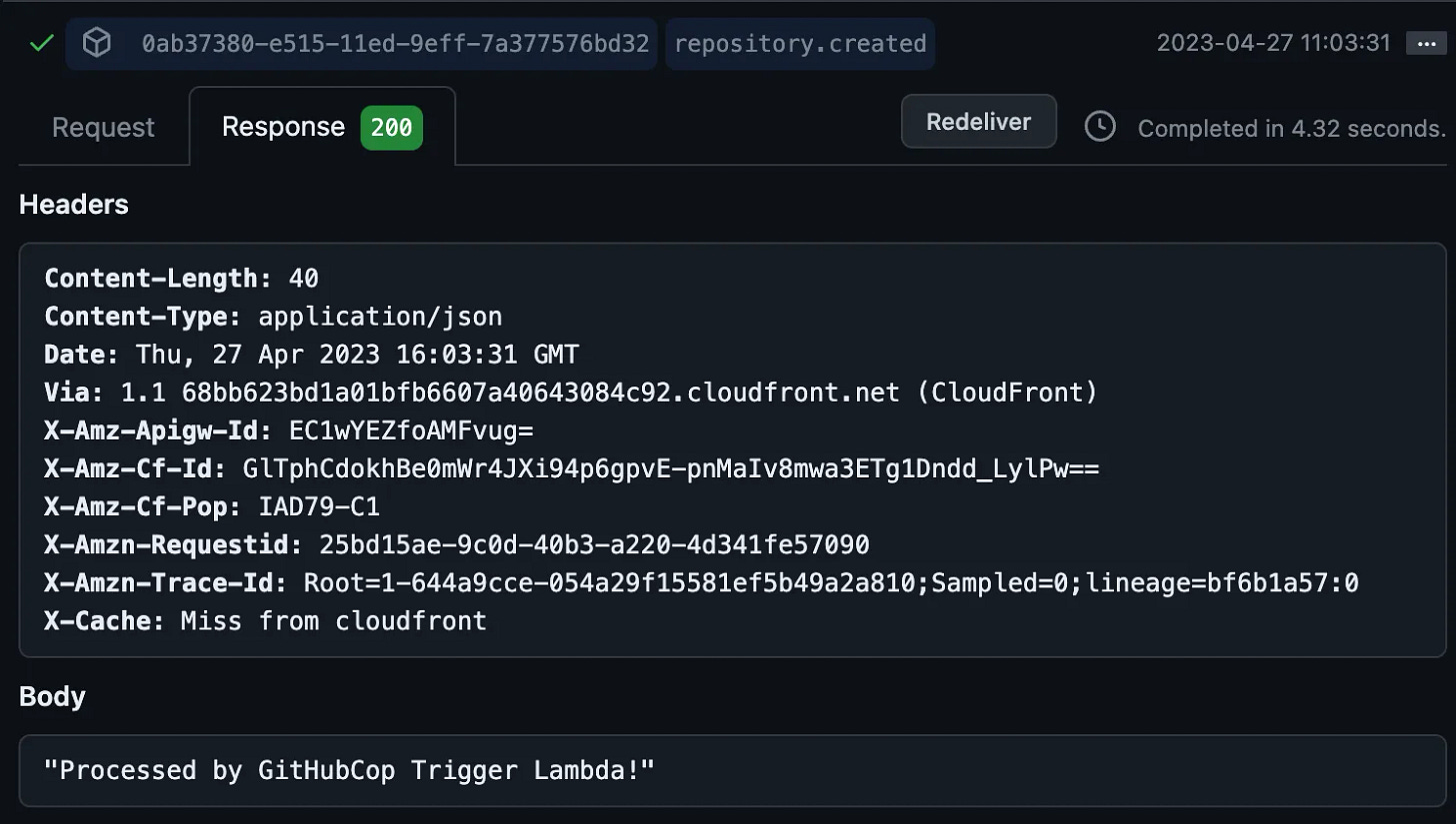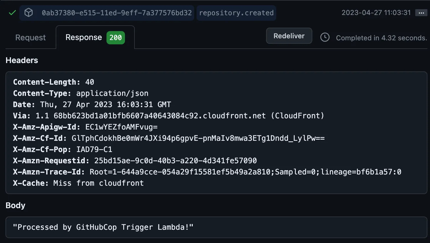 The GitHub Apps UI even rewards us with the happy green checkmark, that it got the http 200 code back, and if you scroll down, you’ll see our message — Processed by GitHubCop Trigger Lambda!. Which is like, so cool.