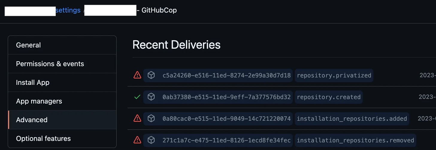 Let’s first go to our GitHub App and look at what the json payload looks like before we send it over. Go to your Org Settings → Third-Party Access → GitHub Apps → (Your app name) Configure → App Settings → Advanced. This very awesome page shows all the webhooks generated by the events the GitHub App is listening to and what their json payload looks like.