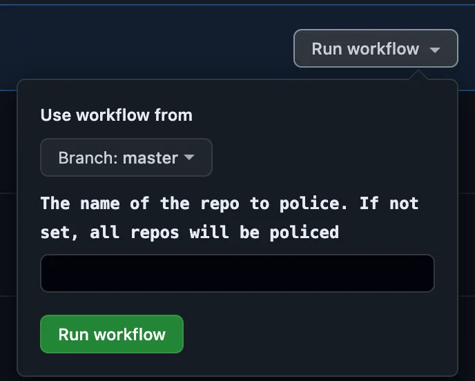 It even looks cool from the GitHub web page UI, when starting the Action by hand — you can type in the name of the specific Repo to police, and it works just the same way as if started from an API call.