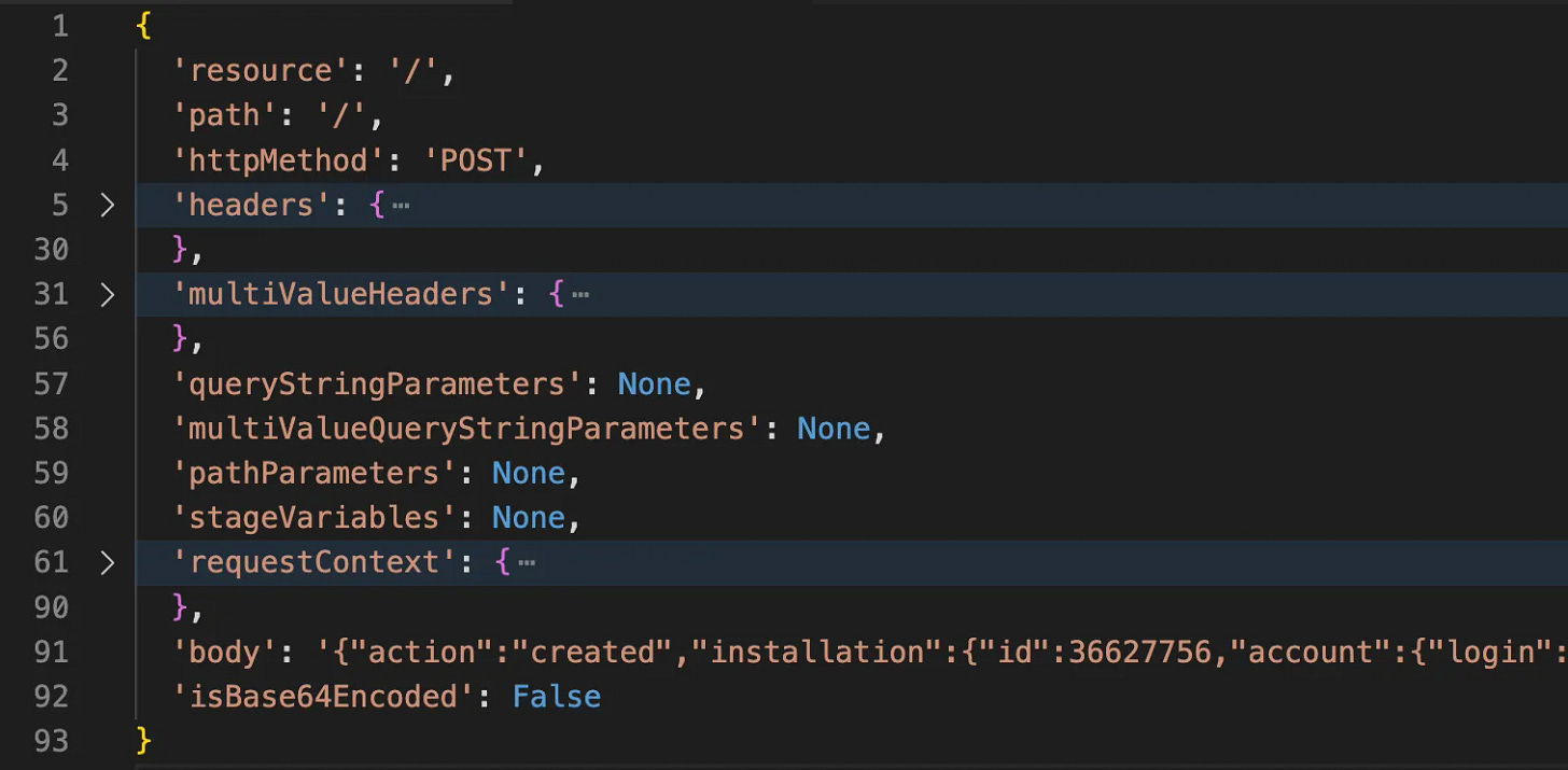 The payload that started our lambda is handed off to our lambda as an object called event. That’s not configurable — that’s how lambda works. The context object is also handed off, which contains all sorts of stuff around the IP that triggered us, and other operational stuff we don’t care about (and will ignore). Let’s first decode the non-json json back to our pretty webhook json. We sent the event object to isolate_event_body function, and receive back our webhook body.