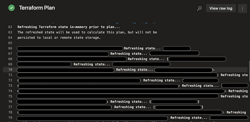 The second idea I loved and immediately implementedāāāfor both the terraform āplanā and āapplyā steps, put a step immediately preceding them to do the refresh, then use the existing terraform CLI flag that disables refresh on those steps.