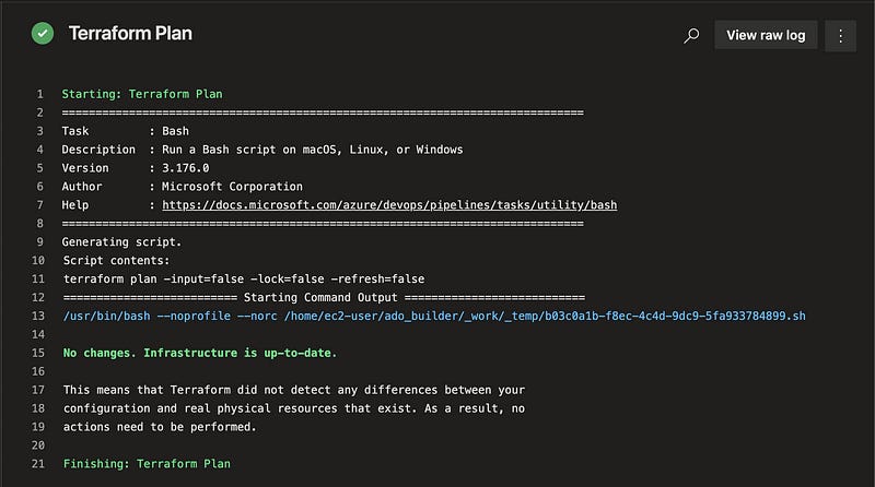 And the output, rather than having several hundred lines of āterraform refreshing (path)ā you get the information youāre looking for right at the top. In this below photo with no changes, the entire output is only 21 lines, even if youāre managing hundreds or thousands of resources.