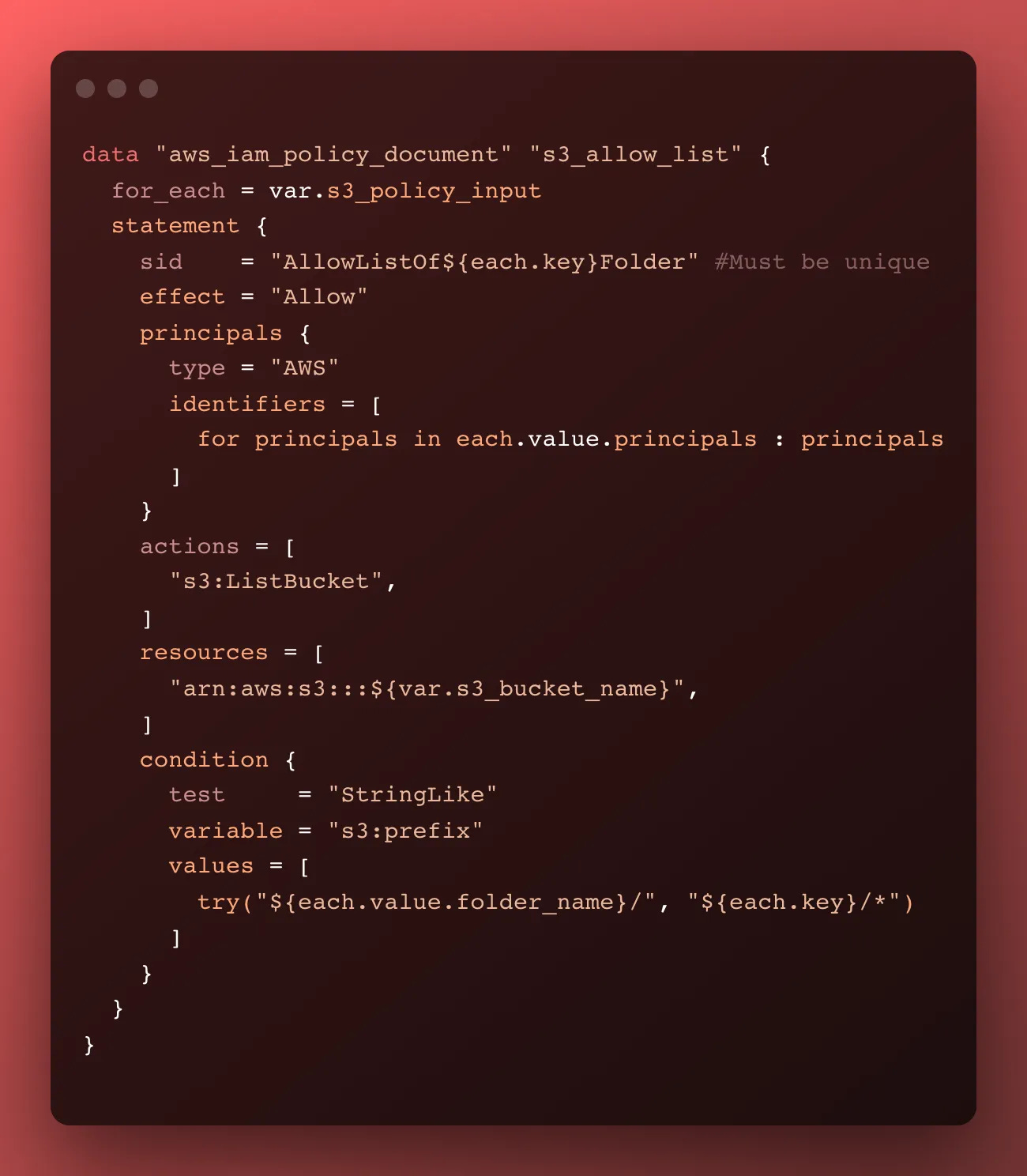 Terraform’s AWS provider has an aws_iam_policy_document resource that permits us to build a stanza of IAM policy. We can specify the specific permissions, and ingest the user ARN as a variable.