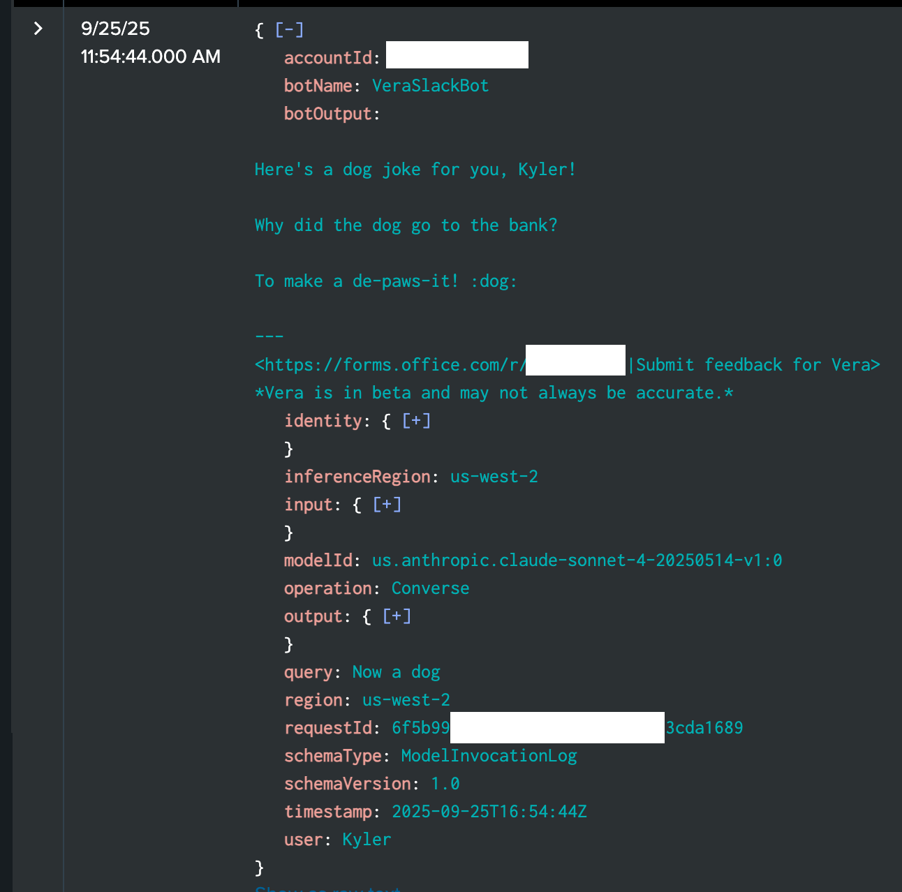This creates a monitoring nightmare. When someone asks âhow much is our Slack bot costing us?â or âwhy did the support bot give a weird response yesterday?â youâre stuck grep-ing through thousands of log entries that all look identical. The raw Bedrock logs contain the model inputs and outputs, but zero context about which application made the call or who the actual user was.