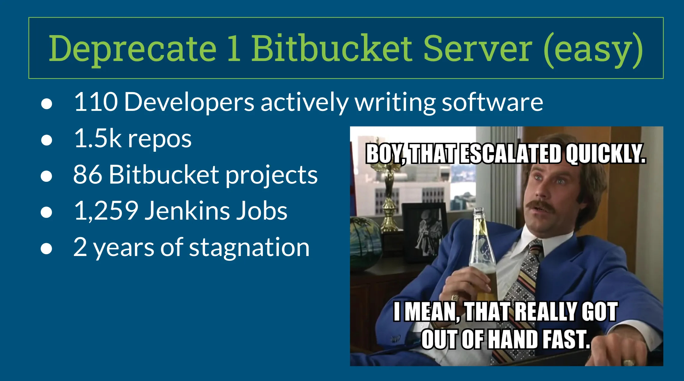 The project specifically was to deprecate a BitBucket server. I mean, that’s easy, right? Well, there was 1,500 code repositories over 86 Bitbucket projects that are executed by 1,259 Jenkins jobs across two Jenkins clusters served by several dozen builders.